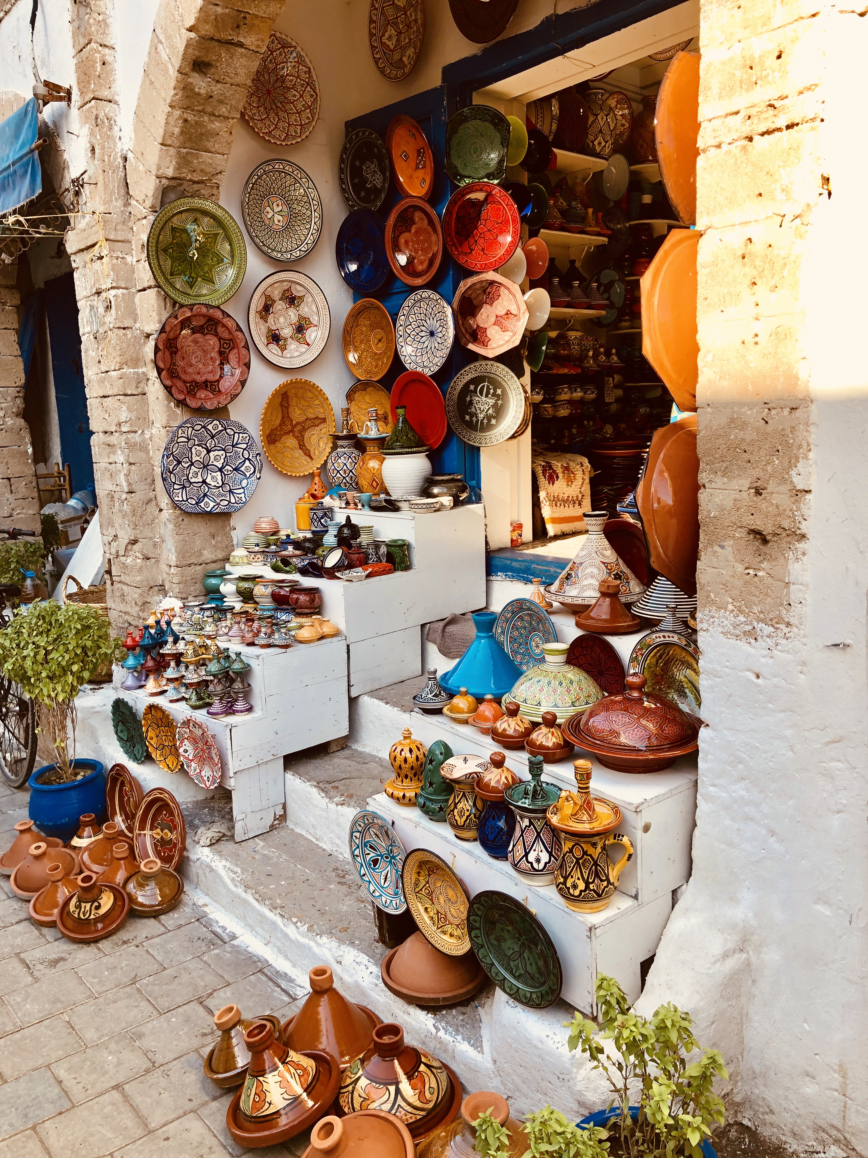 Dopo il porto, i gatti e l’oceano, che già basterebbero, ci vuole un po’ di città. La Medina. Che a dirla tutta non credo sia descrivibile a parole. Ci sono troppi odori, colori, suoni e sguardi di cui parlare. A ogni lato si vendono cose. Irriverente è l’artigianato locale, padrone indiscusso di ogni piccola, minuscola via della città. Persone intagliano il legno, alcune lavorano la pasta d’Argan, altre mettono in mostra gioielli oppure i dipinti. Ci sono ceramiche che tolgono il fiato. Poi lampade, tappeti, borse in cuoio e babouche. C’è chi vende il pesce, chi il pane, chi Twix, Bounty e Kinder Bueno (per la gioia di mio fratello). Insomma è come stare al Tiare la domenica pomeriggio.