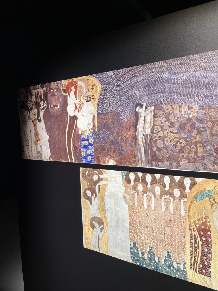 La visita si sviluppa in diverse sale che offrono a loro volta molteplici scenari addobbati con pirotecniche proiezioni, specchi, immagini, dirompenti musiche e oggetti in movimento. Non farò grandi spoiler e mi limiterò a dire che l’insieme di questo dinamico bagno sensoriale dovrebbe portare il fruitore in quella che il regista propone come una dimensione affine al nostro amico Gustavo. Un viaggio nel mondo di Klimt. L’oro è sicuramente protagonista, così come l’alternarsi dinamico di opere e dettagli pittorici in un circolo ipnotico da cui si fatica a distogliere lo sguardo. Dovendo proprio fare una critica (e facciamola dai) la scelta del volume e del repertorio musicale ha un po’ sovrastato il resto delle mie percezioni, lasciandomi un po’ frastornata e irritata all’uscita dalla mostra. Lo stesso effetto, paro paro, che mi suscitò la visione di Mine Vaganti di Ozpetec. Sarà un caso?